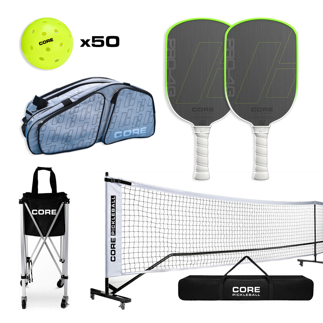 Designed for instructors, drilling partners, and club pros, the Coaches Bundle is the ultimate practice station. This kit centers around the Premium Cart with Wheels, essential for high-volume drilling, paired with a massive 50-pack of CORE Pro Balls so you spend more time hitting and less time shagging balls. You also get two of our top-tier CORE Pro 4G Paddles—engineered for elite performance—and the Pro Tour Bag to transport your high-value gear safely. It’s not just a bundle; it’s a business-in-a-box for serious coaching.