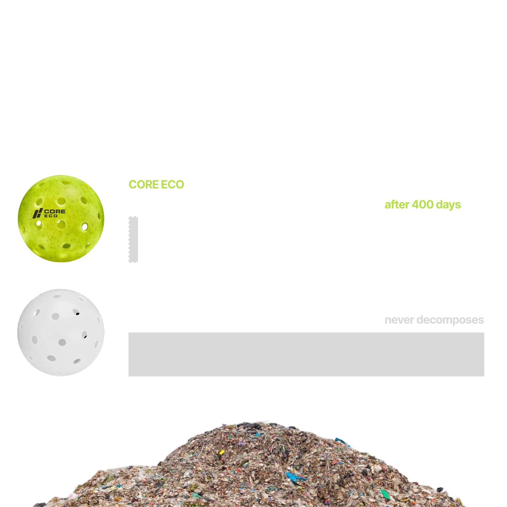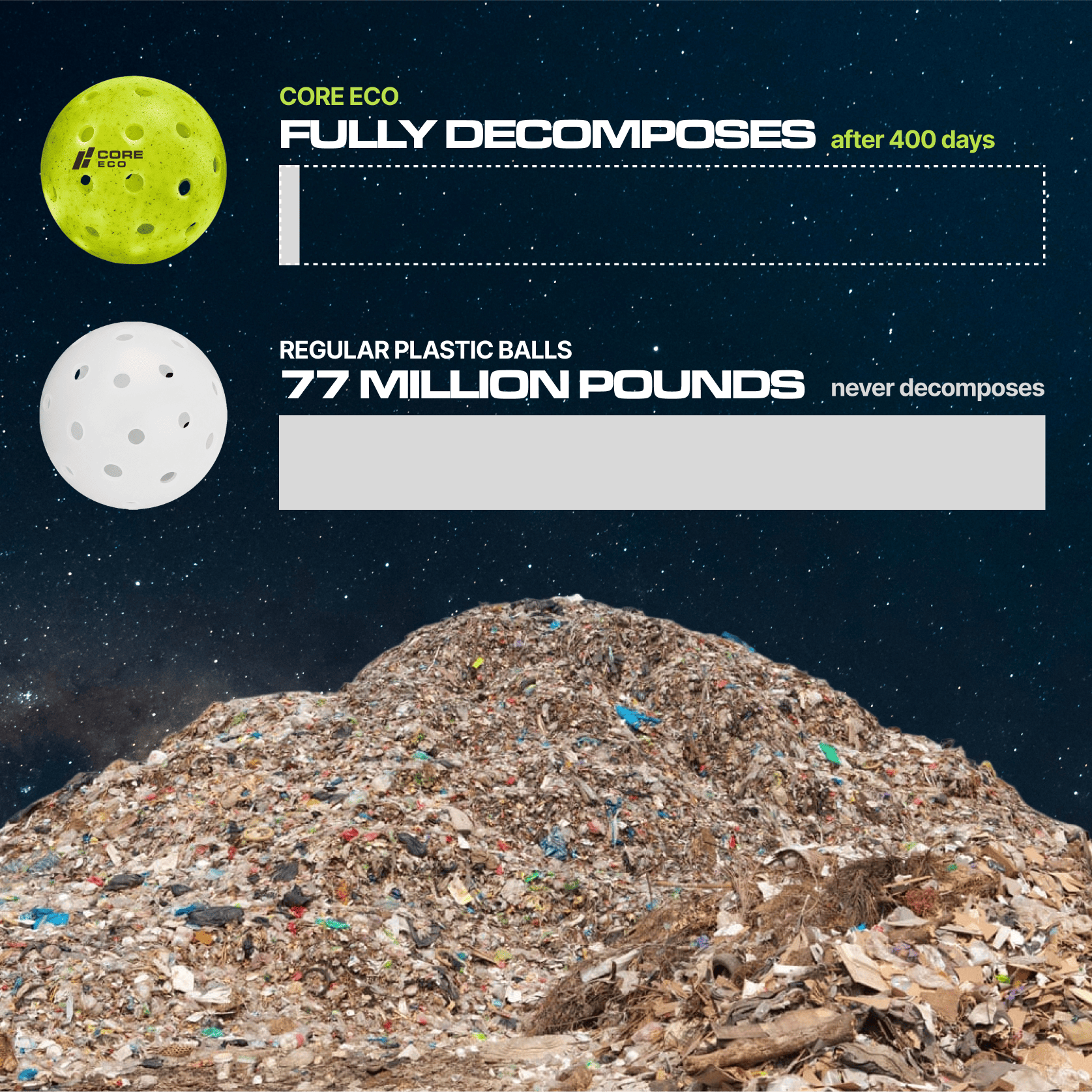 Did you know that the sport of pickleball produces 77 million pounds of plastic every year? Since most plastic is not recyclable, it ends up in landfills and oceans, and takes over 500 years to break down into microplastics that never truly decompose. CORE ECO helps solve this problem by fully decomposing in only 400 days.